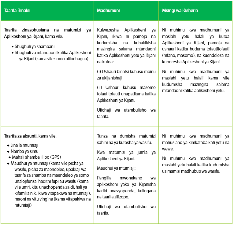 Katika muktadha wa matumizi yako ya Aplikesheni ya Kijani, tunakusanya, tunahifadhi, na tunatumia taarifa zako binafsi kwa mpangilio kama ilivyo katika kipengele cha ‘taarifa binafsi’ hapa chini. Pia, hapa chini utaona lengo la uchakataji na msingi wa kisheria tunaoutumia kwa kila aina ya taarifa binafsi tunayoichakata kuhusu wewe.
